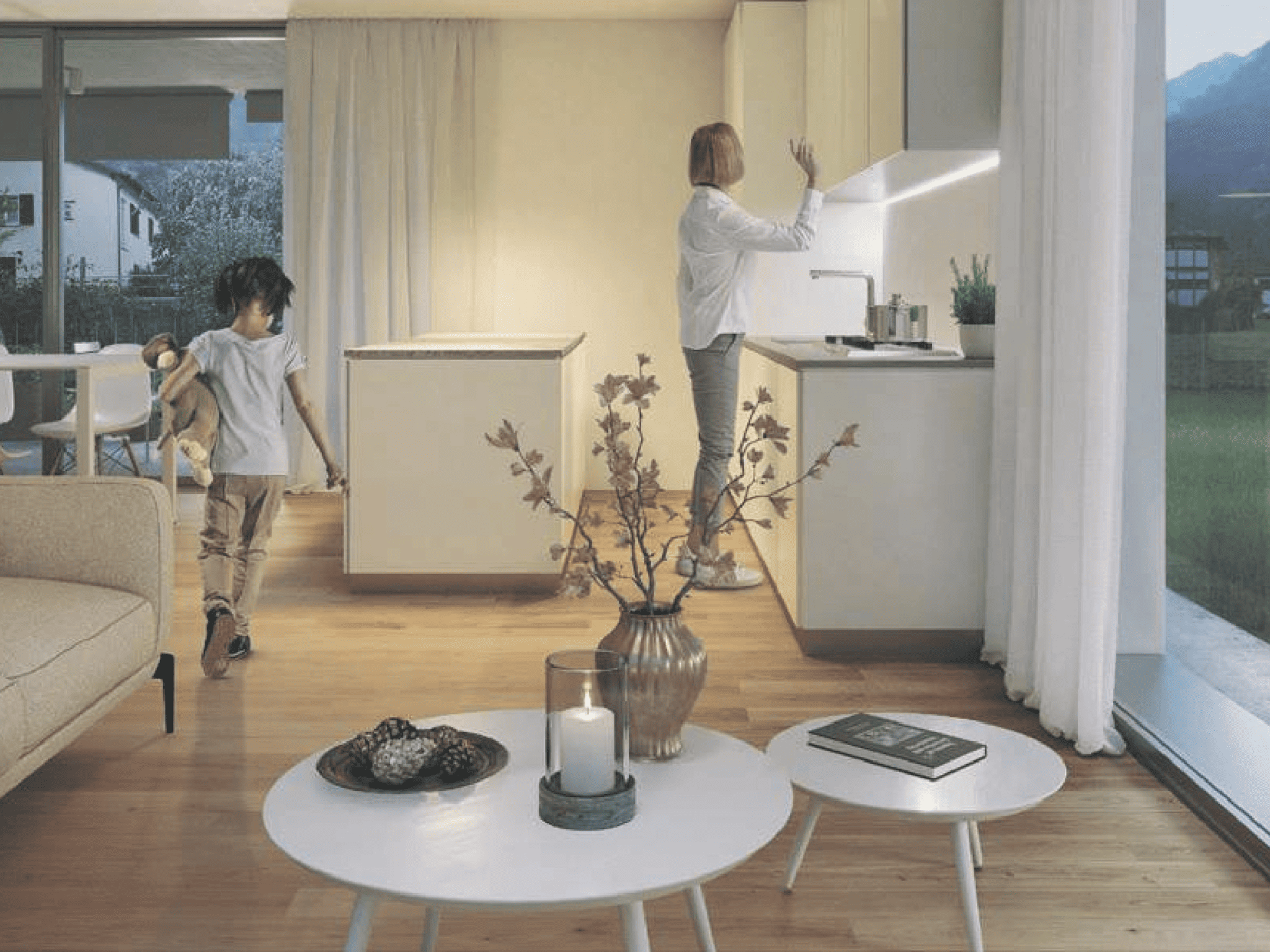 • Cucine complete comprensive di apparecchi V-Zug, piastra ad induzione, mobili colore bianco, con gole in acciaio inox e piano di lavoro in grès, colore grigio;