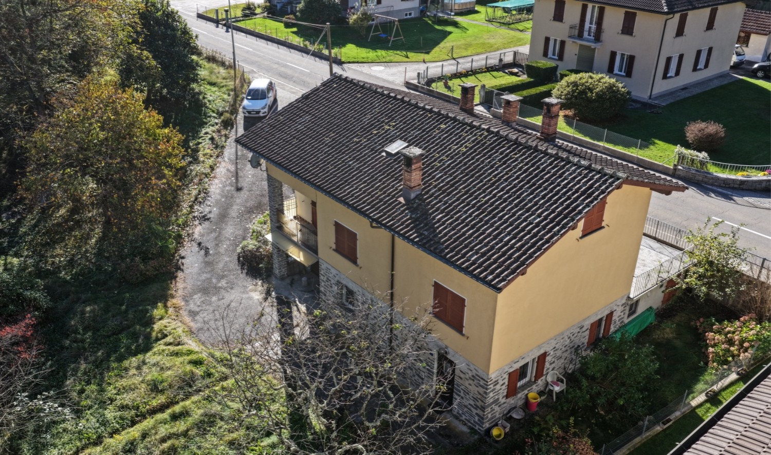 L’immobile si sviluppa su due livelli principali più un ampio solaio “grezzo”, collegati internamente da scala, per una superficie abitabile di circa 90 m², inserita in un terreno di 1’471 m², con strada privata di accesso e due posti auto esterni disponibili.